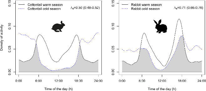 New research shows introduced rabbits and cottontails in North Italy share similar day-night patterns year-round, especially overlapping in warmer months. Predators align more with cottontails, but little temporal separation occurs, suggesting spatial tactics help both species coexist.